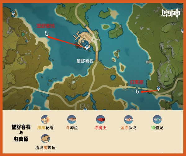 璃月的钓鱼地点能钓到这些鱼:甜甜花鱂、擒霞客、水晶宴、斗棘鱼、流纹褐蝶鱼、苦炮鲀、赤魔王、金赤假龙、锖假龙,还有璃月特有的长生仙,以及花鱂。