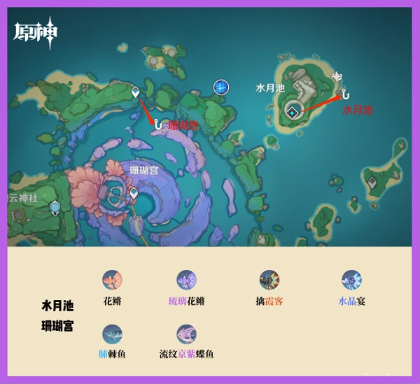 稻妻的钓鱼点包含:离岛、甘金岛、踏鞴砂、名椎滩、水月池、珊瑚宫、越石村东以及越石村西。