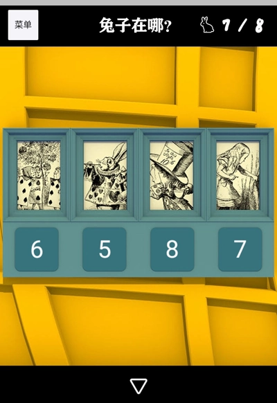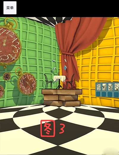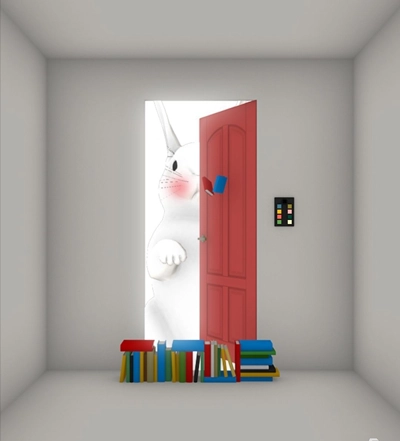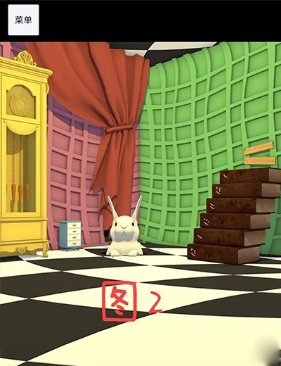 取完钥匙后,前往图四。在那本超大书籍的左下角,有一扇黄色的门。先使用闹钟叫醒把手,然后打开这扇门。门打开之后,便进入找兔子的游戏环节。