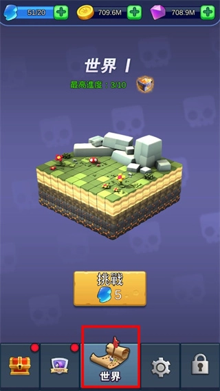 1、第一步,大家进入游戏后,点击下方的“世界”,接着点击“挑战”,即可开始游戏。
