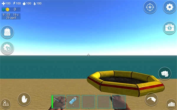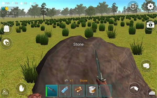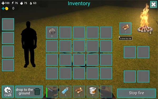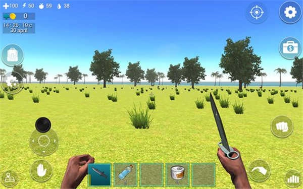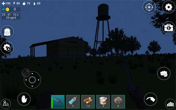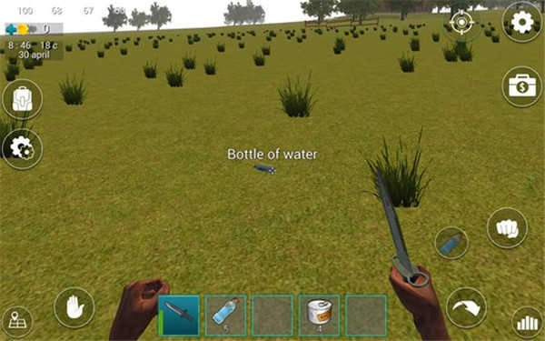 屏幕下方的道具栏里,放着一把匕首和5瓶水,只需点击匕首,就能将其拿在手中。而在屏幕左上角,有四个图标数字,它们依次代表着血量、体力值、饥饿值以及口渴值。