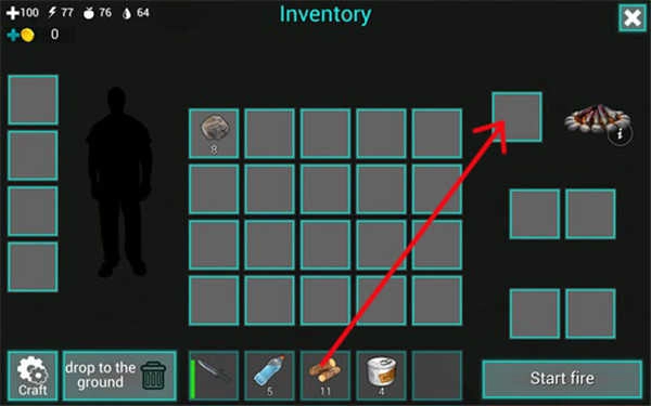 此时,火堆和背包会出现,我们得把木头拖到火堆里,要是不添加燃料,火堆是无法燃烧的。