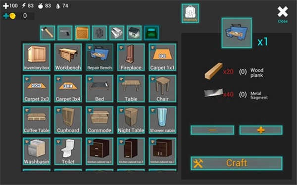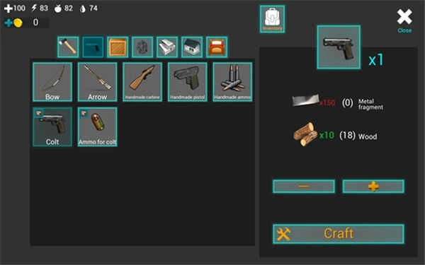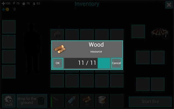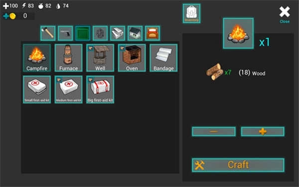 但当下我们首要任务是制作一个火堆,制作火堆需要7根木头。点击火堆,接着点击右下角的“Craft”,就能完成制作。