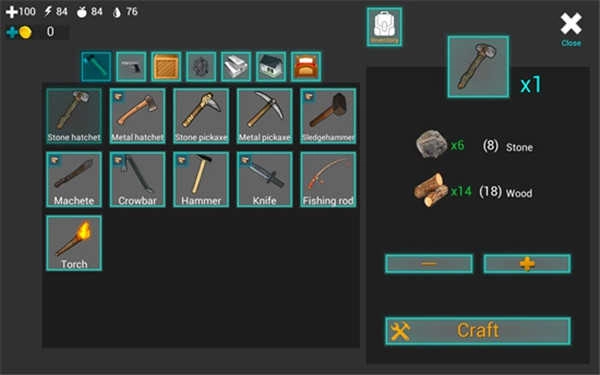 天色逐渐暗下来了,我们得制作火堆。点击屏幕左侧背包下方的“齿轮”按钮,便能打开合成栏。在合成栏里,我们能够看到各类工具的合成公式以及所需材料。
