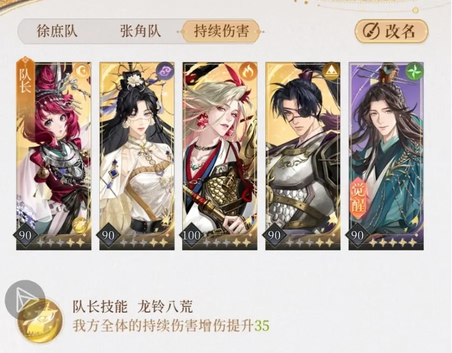 2. 张角队:这是一支在一回合打日常以及刷6 - 24关卡时无需手动操作的队伍。其常见的搭配队友还有盾权和逃课郭嘉。(张角虽然身板较脆,不过好在队友都具备回血能力,玩起来也是相当畅快。)