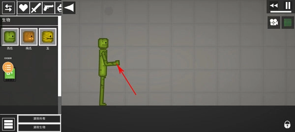 3、接着抬起胳膊,双击西瓜角色的胳膊,此时会弹出删除、冻结、静置碰撞、启用等选项,选择冻结,胳膊便会静止不动。