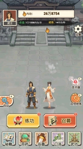 2. 除招募侠客外,秘籍、丹药、兵器、门派、武功等玩法也一应俱全。通过持续培养,逐步提升你的战斗力。