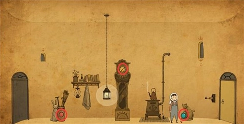 此关信息略显隐晦,关键信息隐匿于中间墙壁的4幅图里。第一步,观察两侧门处月亮的状态;接着,依据图中月亮状态以及兔子手指的指向,来决定进入哪扇门。当四幅图上的蜡烛都被点亮,就能顺利通关。