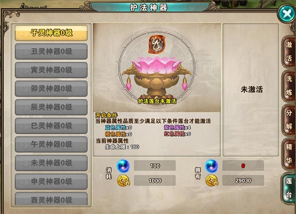 相应神器已激活,当前所佩戴神器的属性条目数量为4条,且这4条属性的品质均大于或等于莲台的开启条件。(需注意,每个护法莲台强化的激活条件是相互独立的。)