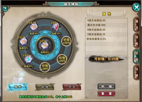 现世:能够进行20次祈福,祈福时符文槽属性将随机获得10%的加成,不过单个符文槽的加成上限为50% 。