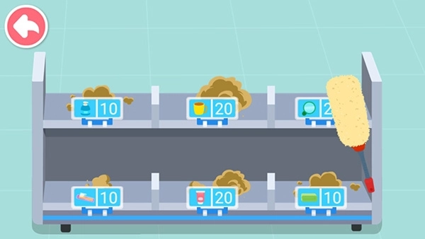 然后就需要宝宝把放货物的货架弄干净啦,点击右边的鸡毛掸子将灰尘扫干净。