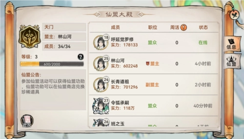 玩家可以通过仙盟大殿,查看所属仙盟的相关信息,例如在任盟主、成员数量、仙盟等级、成员每周活跃度以及在线状态等。
