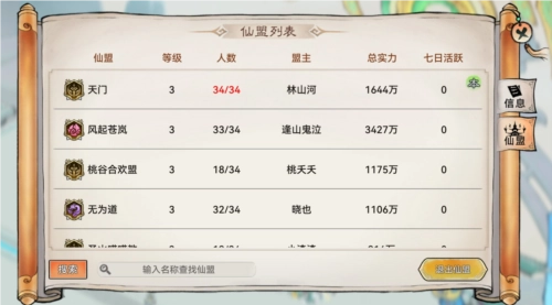 右侧的【仙盟】:最强祖师中可查看其它最强祖师仙盟的相关信息(等级、人数、盟主、总实力、七日活跃)