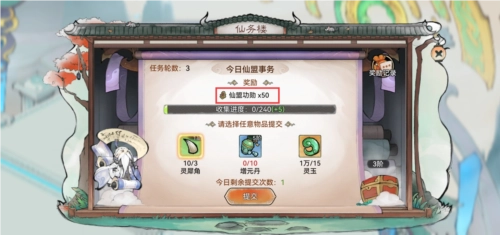 3.【仙务楼】玩家每日可通过提交仙盟事务所需物品,获得【仙盟功勋】,每日会有提交次数限制。