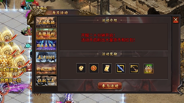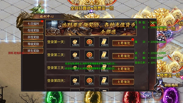 1、龙城传奇开服福利:新人见面礼,免费赠送大量福利道具。