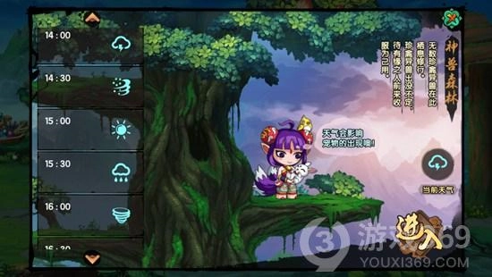 轻点公治灵儿,就能进入下方这个界面哟。界面左边展示的是神兽森林的天气预报,而右下角会呈现当前时段的天气状况。