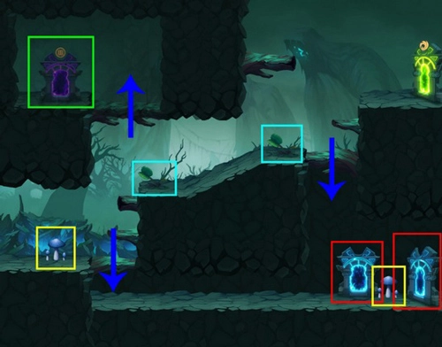 注意事项:这里存在1棵捕蝇草以及1棵毒蘑菇。在上下两个位置会随机出现1个蓝门。