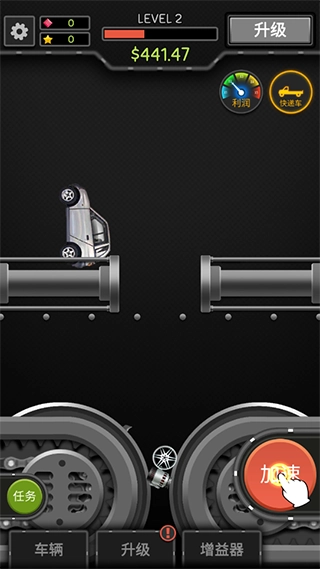1、游戏目标:通过碾压废旧的汽车所产生的零部件来赚取收益,点击加速会让两侧的碾压机器速度得以增加,从而大大的加快碾压效率,最终获得更多的收益。
