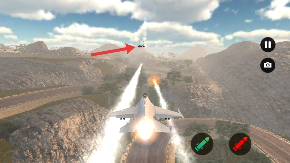 4、在游戏进程里,操控战斗机进行飞行操作,借助右侧的导弹按钮来发射导弹,精准瞄准并攻击目标。在此过程中,要留意躲避障碍物,以顺利达成任务。