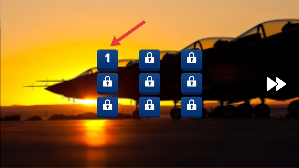 3、随后进入关卡选择页面,此时仅有1号关卡处于解锁状态,点击此关卡,就能进入游戏的第一关,继而开启驾驶战斗机执行任务的旅程。