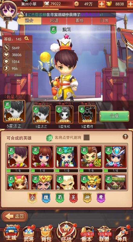 1、融合本质上等同于武将升星,其优势在于在同一界面,能够同时查看4星武将融合成5星、5星武将融合成6星分别还差多少个材料武将。