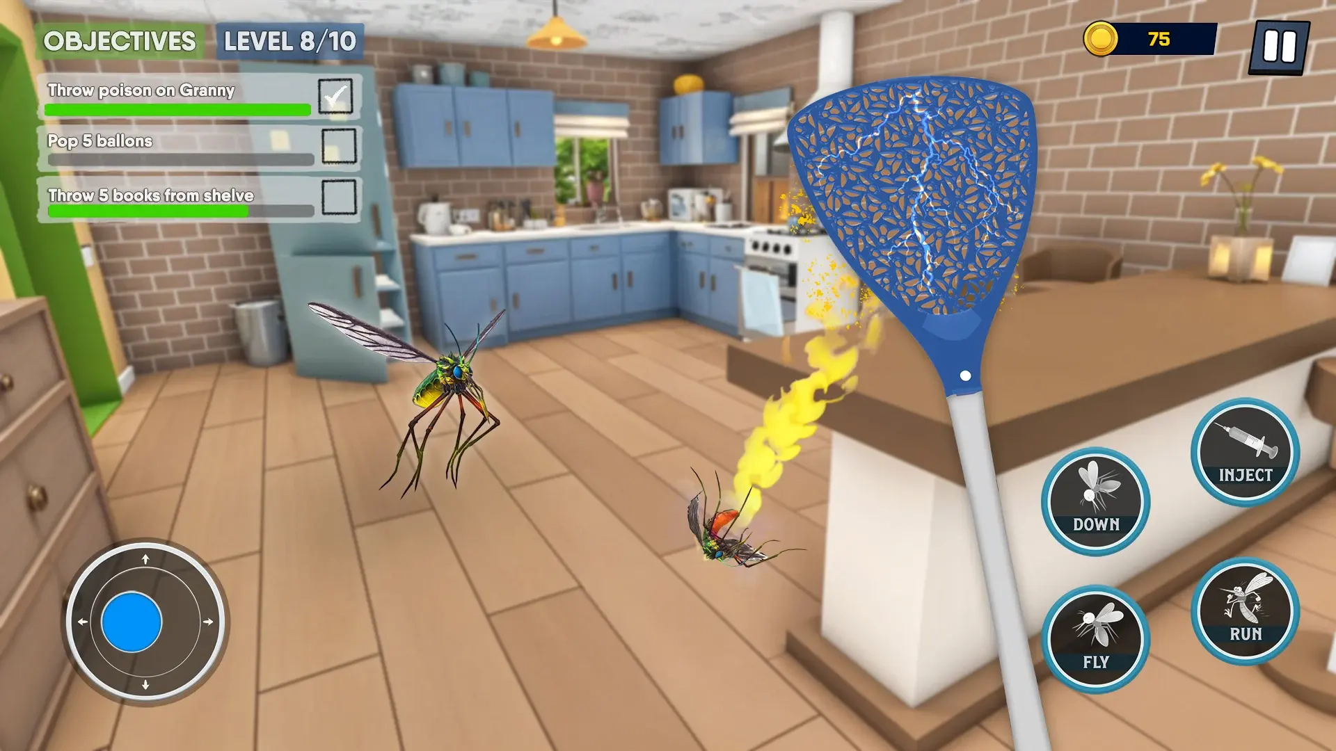 1. 该游戏运用第一人称视角来操控蚊子飞行,玩家借助虚拟摇杆掌控方向,轻点屏幕就能实现加速飞行或者俯冲叮咬的操作。