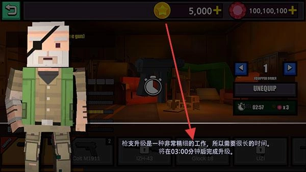 3、武器升级提示:武器升级需要一定时间,界面将显示“03:00分钟后完成”。你可以选择耐心等待,也可以使用加速道具。升级完成后,即可获得更为强大的武器。