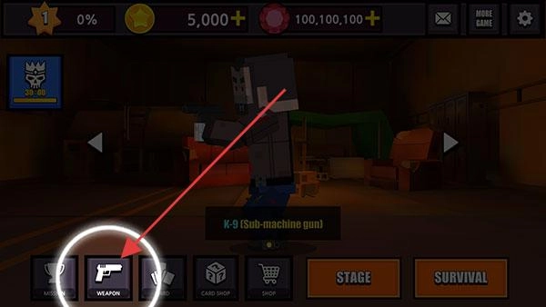 2. 在主界面,点击下方的【WEAPON】,即可进入武器管理页面。在此页面,你能够切换武器、对武器进行升级,从而为战斗做好准备。