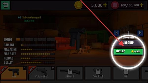 1. 在武器界面,选中“K-9”冲锋枪,接着点击【LEVEL UP】,通过消耗金币来提升该武器的等级,以此强化武器属性,为战斗提供助力。