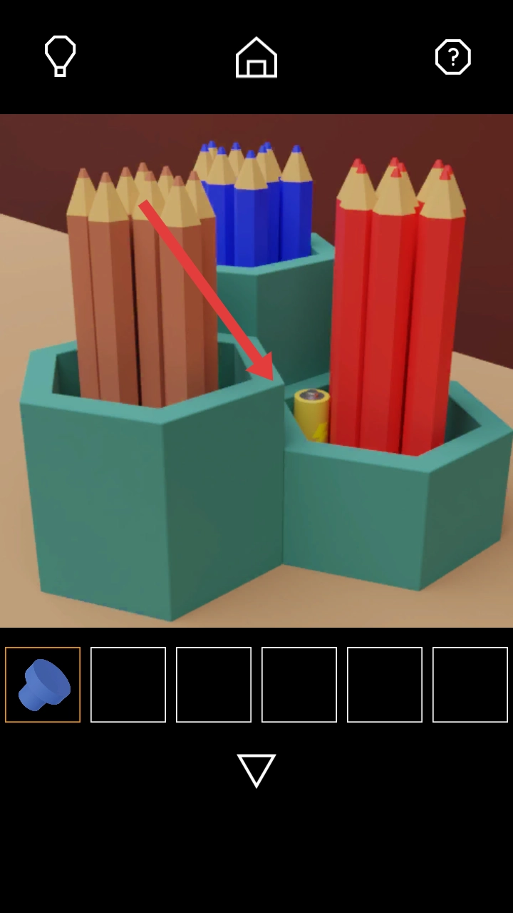 2、要查看选中物品栏里的蓝色把手,接着点击桌面铅笔筒的间隙处,获取藏在那里的黄色电池。