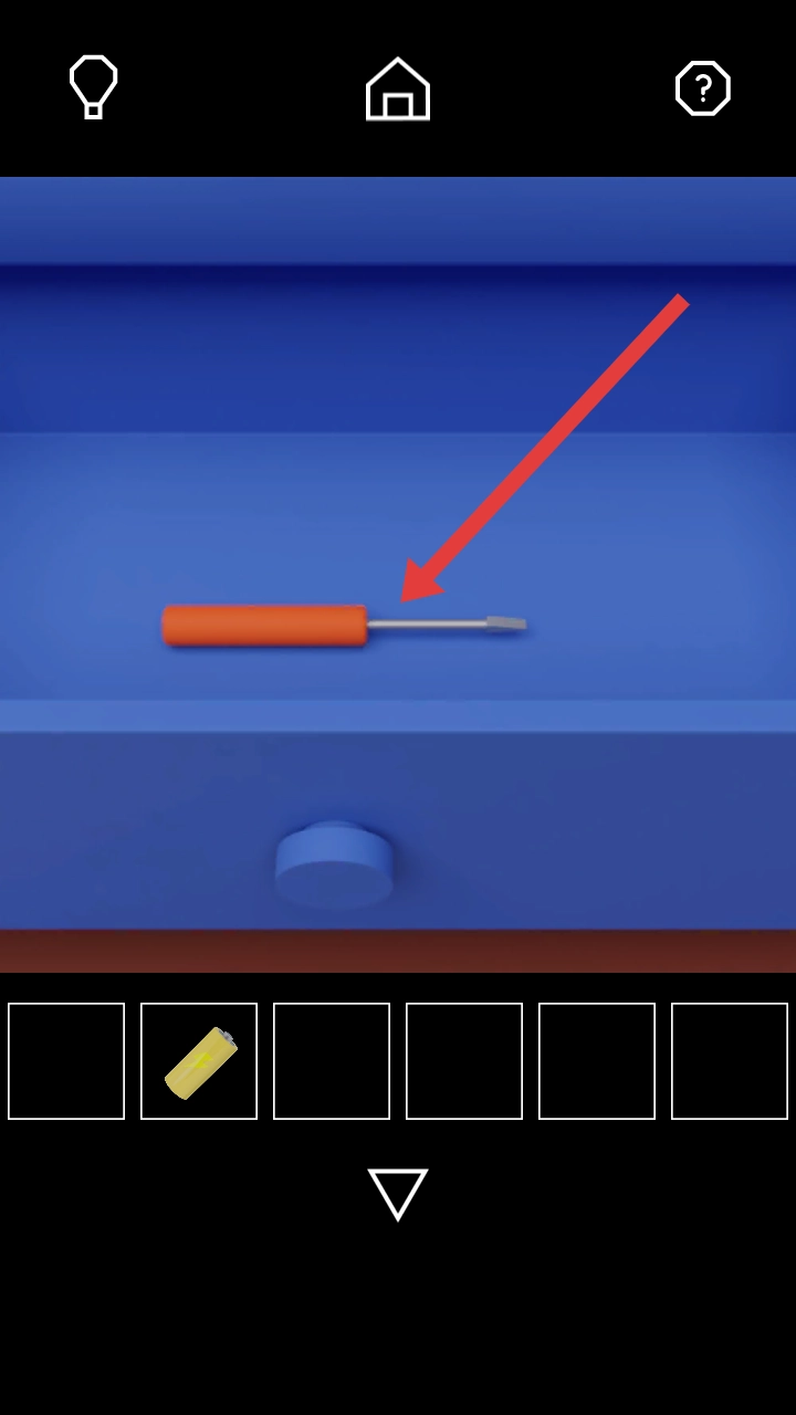 3、获取黄色电池后,接着沿着踢脚线进行探索,把蓝色把手装在抽屉上,打开抽屉,拾取橙色手柄的螺丝刀道具。