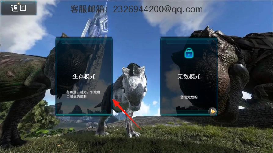 1. 在初始界面,选择受血量、耐力、饥饿度、口渴值限制的生存模式,开启恐龙世界的冒险。