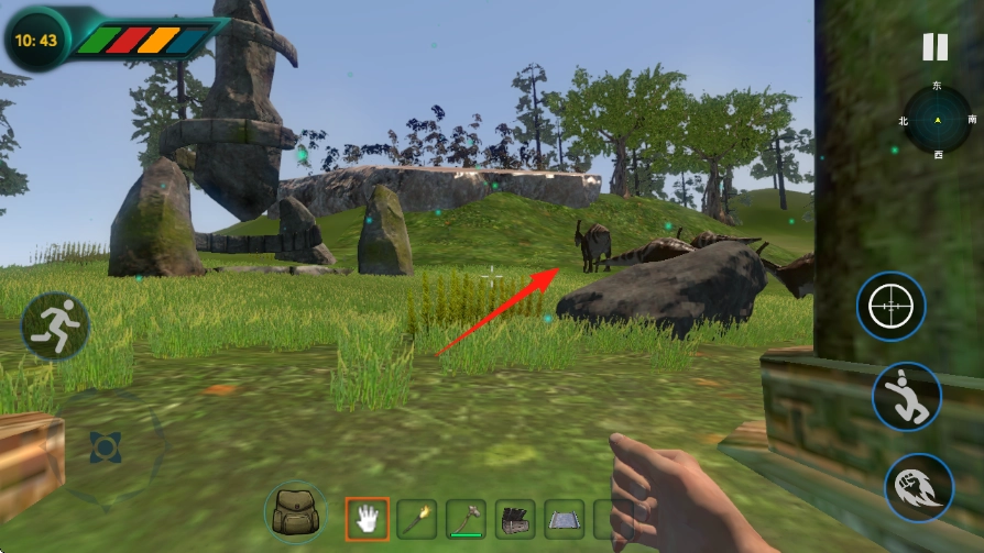 2、踏入开放场景,途经草地与巨石阵区域,寻觅食草恐龙的踪迹,为狩猎预先做好准备。