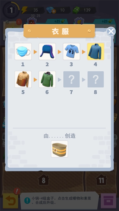 6、倘若想要实现升级,需借助篮子制作出8种各不相同的衣物,当成功集齐这8种衣物后,便能满足升级条件。