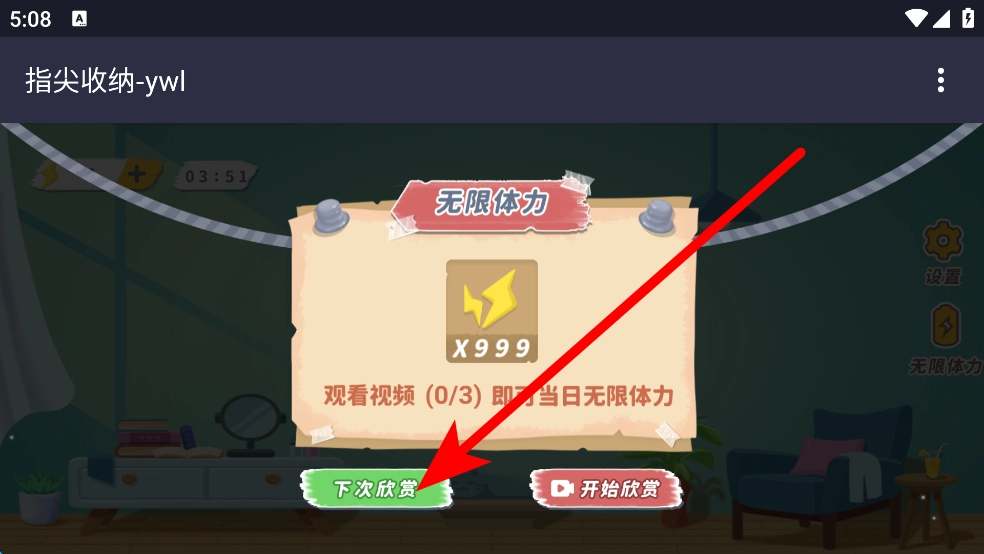 4、倘若在游玩过程中感觉体力不支,可选择观看视频,观看之后就能获得当日体力,如此一来便不受体力限制,能够持续挑战收纳关卡。
