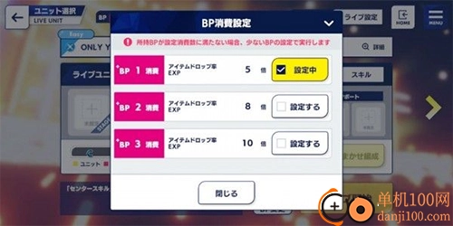 玩过ES1的玩家想必都清楚,ES1升级相当轻松,活动期间升级还能恢复全部体力。而ES2虽说前期升级速度较快,可后期对升级的要求会愈发严苛。因此,要是有办法,我们得尽可能珍惜体力。在打歌界面,我们能够调节BP的单次消耗,BP单次消耗越多,得到的单次奖励也就越多,但BP的性价比会随之降低。所以,要是可以的话,我们尽量别选太高的单次消耗,毕竟能多赚一点是一点。