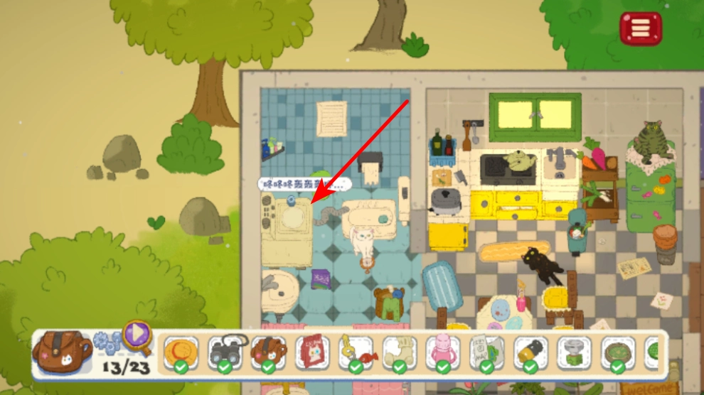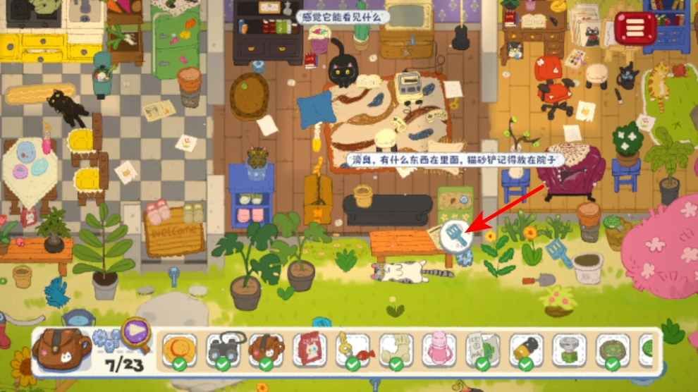 1. 进行场景道具收集工作,于室内场景内收集猫砂铲之类的道具,达成物品收集任务,推动收集进度提升。