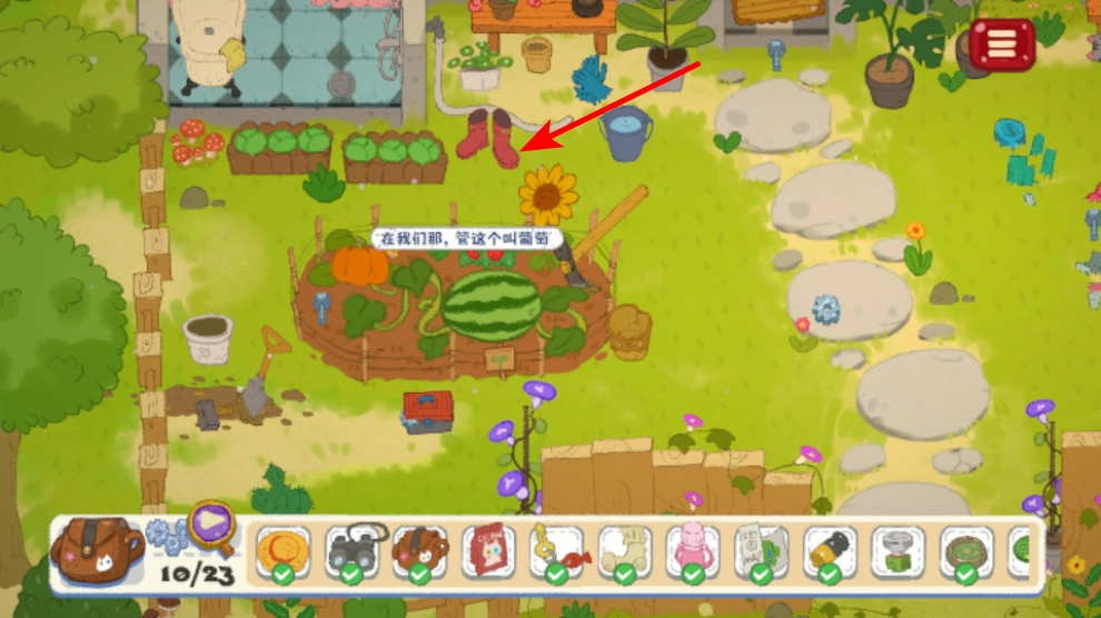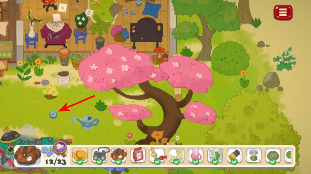 3、留意花园的细节之处,于花园场景里寻觅蓝色小花等物件,以达成收集任务,当前收集进度为12/23 。