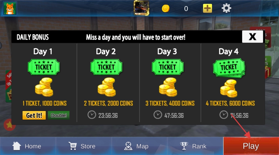 打开每日福利页面,第一天能领取一张门票和一千金币,点击“领取”按钮获取奖励后,再选择“开始游戏”进入关卡挑选界面。