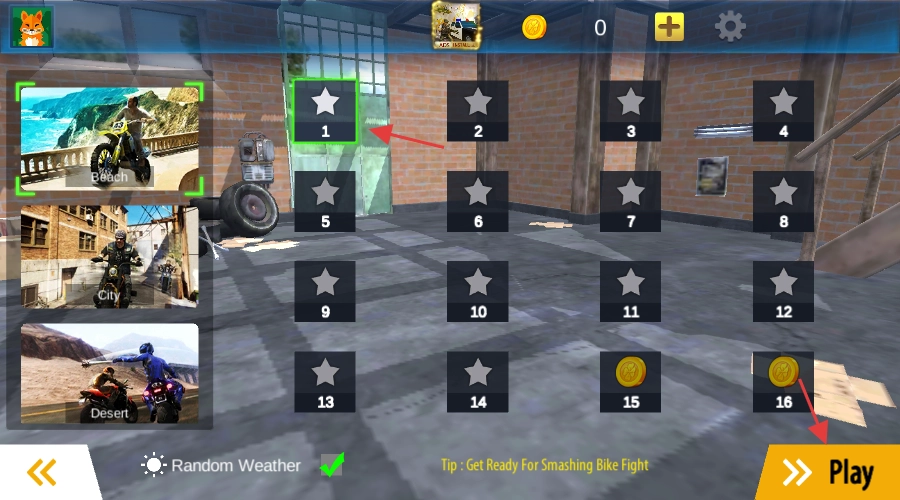 在关卡选择界面,挑选带有绿色边框的关卡1(场景示例为Beach),点击右下角的【Play】按钮即可开始游戏。