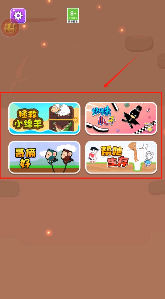 点击紫色齿轮图标进入游戏设置界面,查看适龄提示信息后,挑选救小羊、斗鳄鱼等自己感兴趣的游戏。