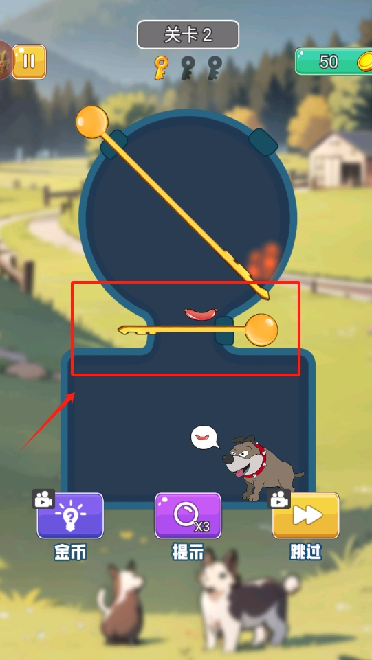 进入第二关后,需要寻找钥匙开启大门,同时收集沿途的金币;遇到难以通过的地方可以使用提示功能;另外要留意三只小狗的干扰,避免它们影响进程。