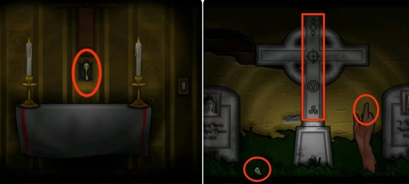 走到走廊尽头靠右的位置,把之前找到的蜡烛和宝石分别安放到烛台与十字架上。拿到出现的钥匙后,用它解锁旁边的门进入后院,完成两座墓碑上的拼图任务。之后取走左边新出现的玩具钥匙,再把戒指佩戴到右侧的手指上,就能得到第三块画像碎片了。