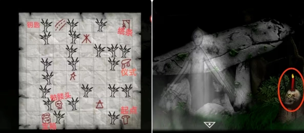 打开栅栏后,按照地图提示从起点出发,像上图展示的那样收集骷髅头、蜡烛和纸条,接着依据纸条上的指引前往仪式点开展操作,并用打火机将蜡烛点燃。