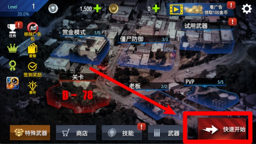 想要快速进入关卡挑战?只需点击主界面右下角的“快速开始”按钮,就能直接开启当前关卡,无需多余步骤,既节省时间又便捷,无论是想刷取分数还是挂机完成通关都很适用。