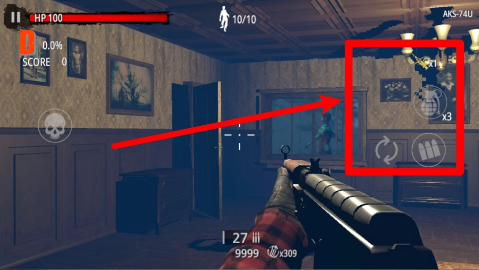 投掷物使用提示:右侧区域显示可用手雷数量,点击图标可快速丢出,适合应对大批靠近的僵尸,爆炸范围广、伤害高,关键时刻能保命。