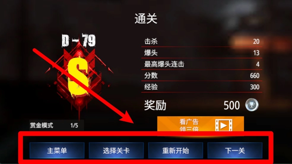 通关后的选项界面:完成关卡后,你可以选择返回主菜单、重新挑战当前关卡或是进入下一关;系统还会展示你的爆头数量、总击杀数以及获得的经验奖励,便于你评估自己的关卡表现。