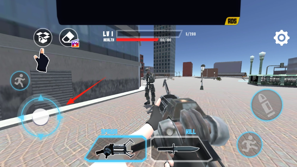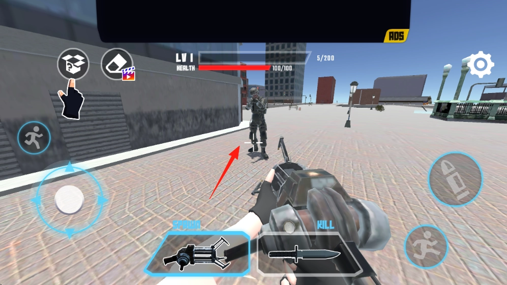 进入游戏后,按照红色箭头的指引行动。前方区域有敌人入侵,右侧的按钮可用于射击、切换武器(枪和刀),请瞄准敌人士兵进行攻击。