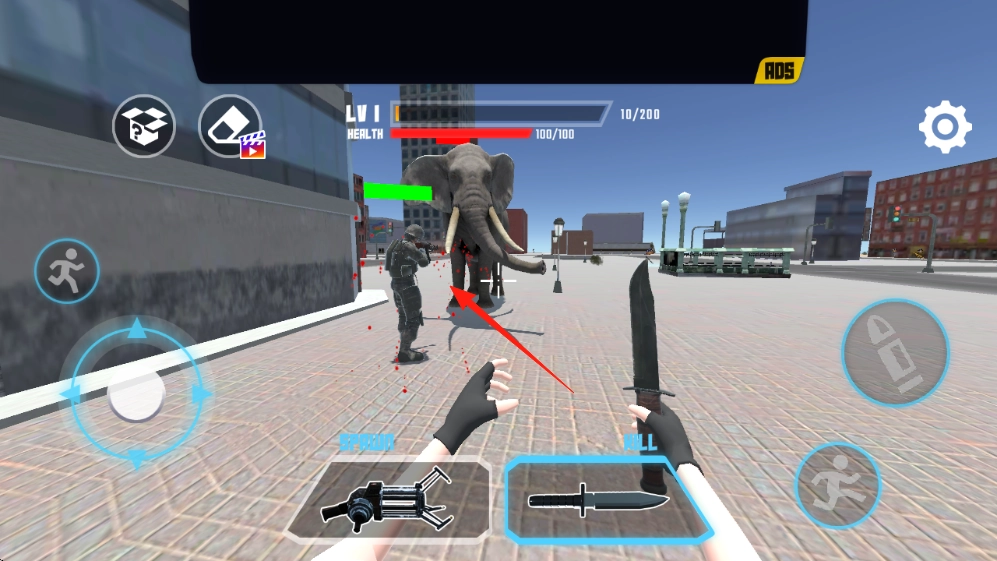 在前方区域,有敌对势力正针对一只大象发起进攻。你可以通过操控左侧的摇杆来调整角色的位置,中间的功能键能够实现枪械与刀具的切换操作。建议你切换到刀具模式,然后对准敌方目标和大象进行攻击。
