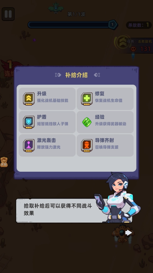 击败敌机后会掉落宝石,收集到足够数量的宝石就能随机获得一项增益效果。
